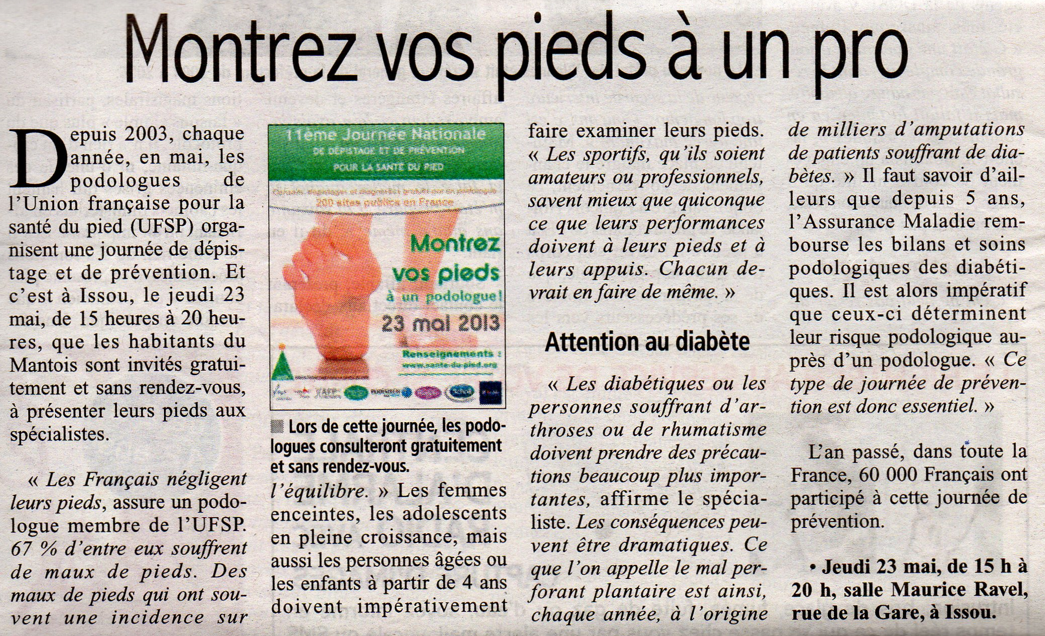Depuis 2003, chaque année, en mai, les podologues de l’UFSP  (Union Française pour la Santé du Pied) organisent une journée de dépistage et de prévention. Cette initiative se déroule en même temps, dans tous les pays du monde.